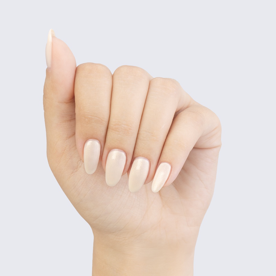 Cream-white with gold shimmer. Light. Semi-translucent. Warm undertone.